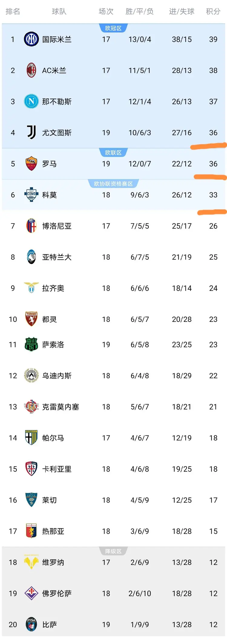 可以看到,尤文图斯队3-0击败萨索洛之后,积36分排名第4,而罗马2-0击败莱切之后,积36分排名第五,而科莫3-0击败比萨队之后,积33分排名第6。其中尤文和罗马都是多赛2场。