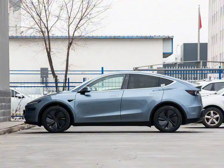 再来看车身侧面部分,Model Y延续了经典的溜背造型,从车头延伸至车尾的流畅曲线不仅提升了美感,还优化了空气动力学性能。车身尺寸为4797×1920×1624mm,轴距保持2890mm的黄金比例,相比老款长度增加了47毫米,车身姿态更加舒展。轮毂升级为19英寸“交互风暴”低风阻设计,封闭式轮辋搭配静音轮胎,既降低了能耗,又减少了路噪。车顶行李架采用隐藏式设计,兼顾实用性和线条整洁度,熏黑车窗边框与车门下方的镀铬饰条形成对比,在极简风格中增添了精致感。