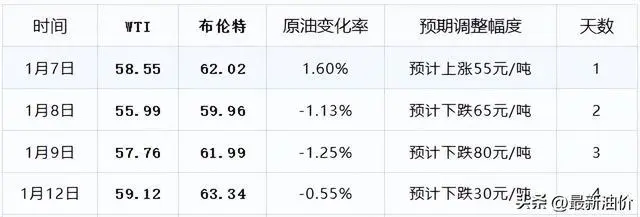 最新国际油价:截至前天周六1月10日收盘价;美国原油报59.12美元/桶(上涨1.36美元,涨幅2.35%);布伦特原油报63.34美元/桶(上涨1.35美元,涨幅2.18%)。