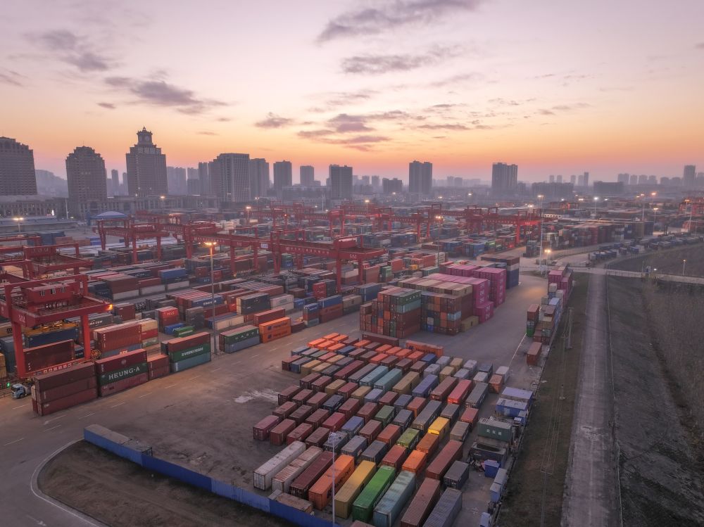 ↑1月14日拍摄的山东港口青岛港外贸集装箱码头(无人机照片)。新华社发(俞方平 摄)