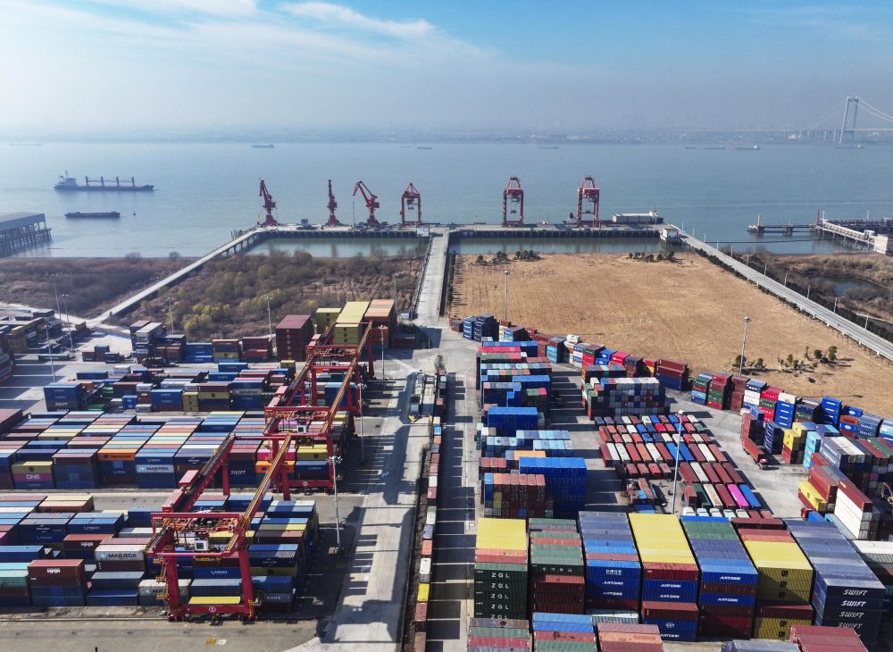 ↑2025年12月14日拍摄的江苏省港口集团南京港龙潭集装箱码头(无人机照片)。新华社发(杨素平 摄)