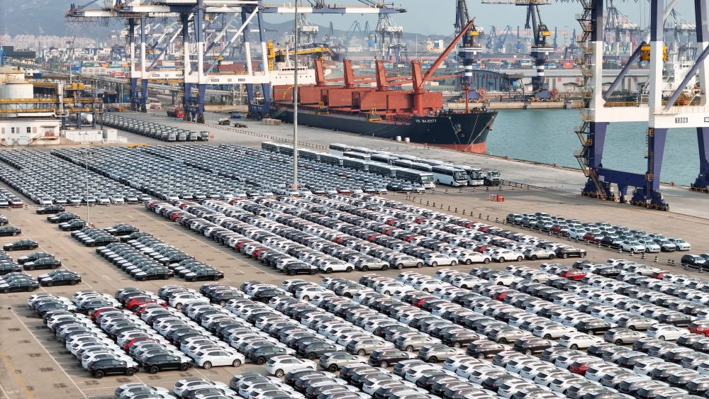 ↑1月14日,大批国产汽车在山东港口烟台港集结等待装船出口(无人机照片)。新华社发(唐克 摄)