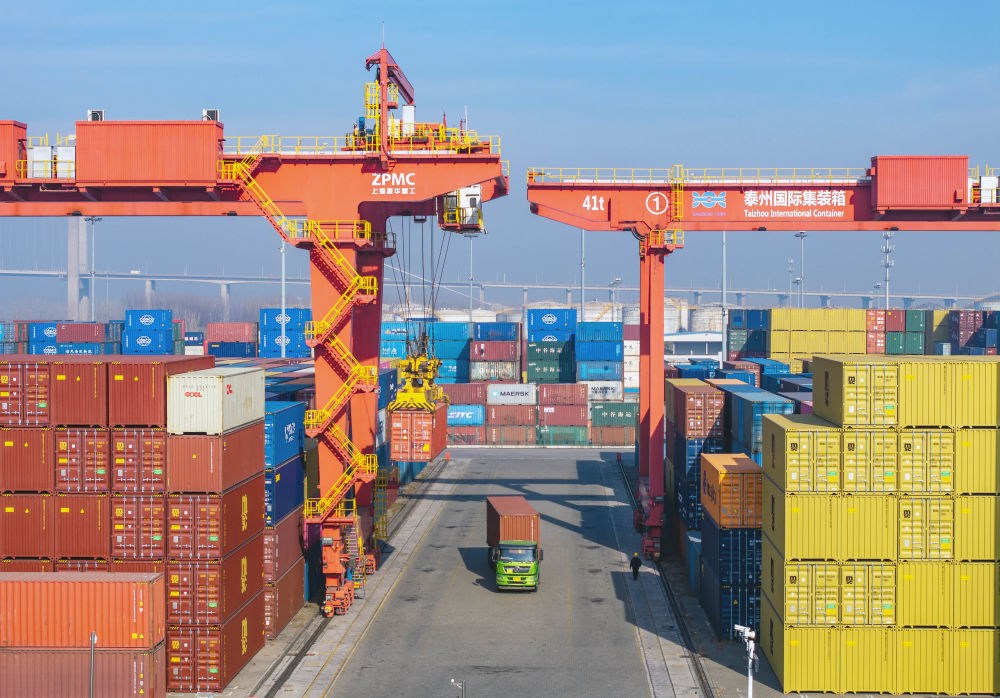 ↑1月14日,运输车辆在江苏泰州港国际集装箱堆场转运集装箱(无人机照片)。新华社发(汤德宏 摄)