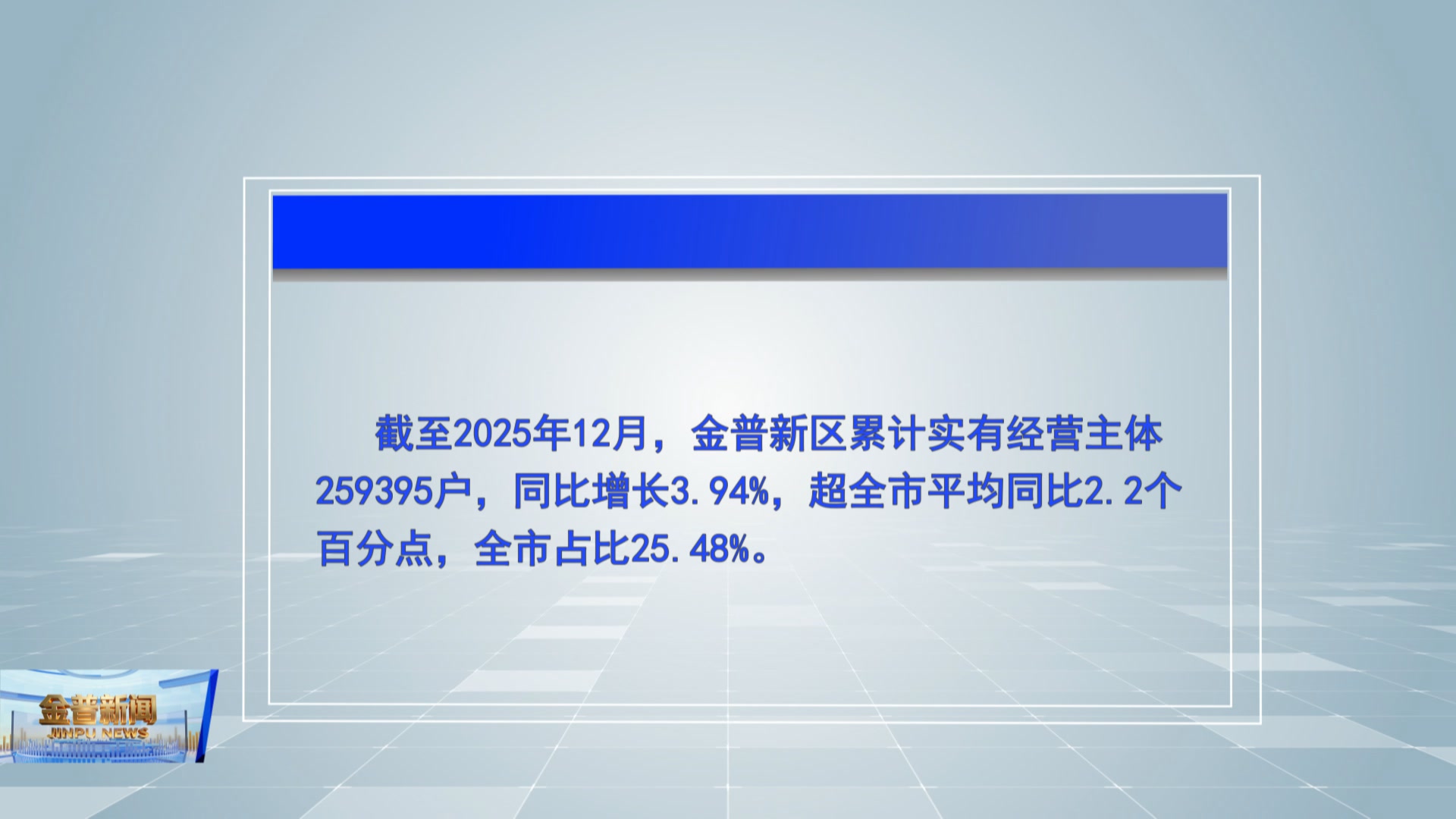 截至2025年12月,金普新区累计实有经营主体259395户,同比增长3.94%,超全市平均同比2.2个百分点,全市占比25.48%。累计实有企业110407户,同比增长3.35%,全市占比28.49%;累计实有个体工商户148272户,同比增长4.21%;累计实有农民专业合作社716户,同比增长1.85%。
