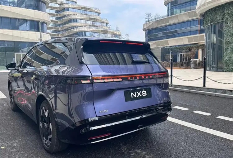 东风日产NX8采用日产家族V-motion设计语言,拥有行业最长2.4米贯穿式星环灯,加上平面化发光logo,与下方矩阵式灯组相互映衬。侧面有隐藏水切和隐藏式门拉手等。车尾有2064颗OLED“量子光幕”尾灯,支持自定义灯语。新车尺寸为4870×1920×1680mm,轴距2917mm。