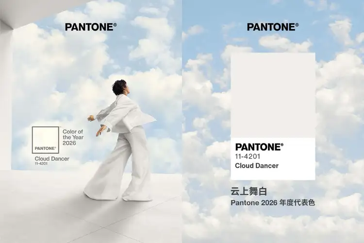 这背后,是一个关于“色彩价值感知”的变化。2026年,潘通发布年度代表色PANTONE 11-4201 Cloud Dancer「云上舞白」,其官方解读是: