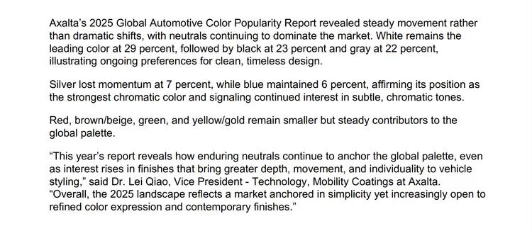 Axalta发布的《2025年全球汽车颜色人气报告》