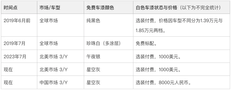 以特斯拉为例,在其品牌扩张最为关键的数年间(2019-2023年),珍珠白长期作为唯一的标准配色,以极高的街头能见度,塑造了大众对“极简电动车”的初始印象。而在中国市场,即便作为加价选装项,那抹标志性的珍珠白也始终占据着绝对的销量大头。而当特斯拉将免费基准色改为灰色,白色重回选装序列,就代表着更多客户愿意为这一抹“极简”埋单。