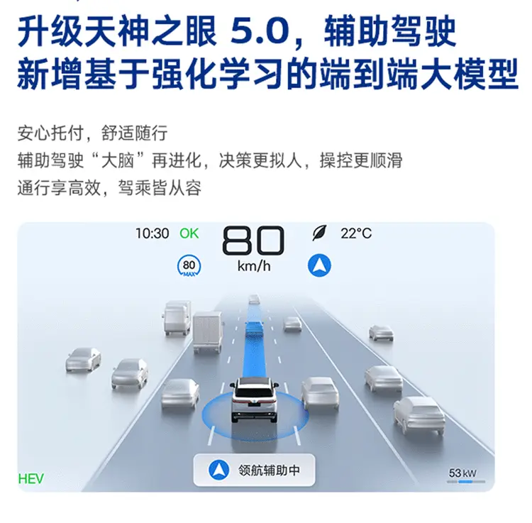 腾势(参数丨图片)N9近日已经通过OTA全面升级了天神之眼5.0,而且它也是比亚迪集团旗下首批先升级天神之眼5.0的车型。天神之眼 5.0搭载最新大模型版本,在全闭环端到端的基础上,新增强化学习能力。此次升级不仅新增高快道路环境下紧急靠边停车辅助功能,还实现两车道掉头、城中村混行、施工改道、借道避让等场景,可以说是在更复杂的场景下也有更顺畅的辅助驾驶体验。另外,本次升级还涵盖隐私声盾、自适应调节、电子木鱼游戏及长续航模式等十余项功能优化。