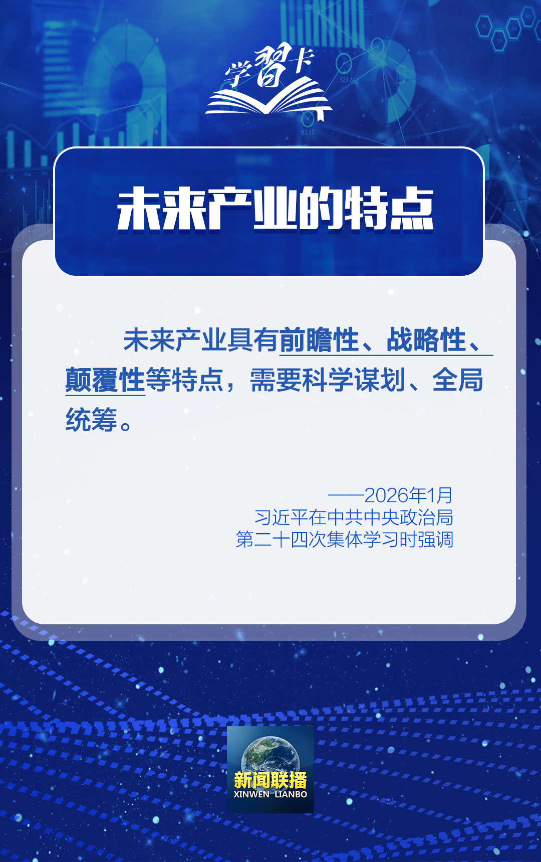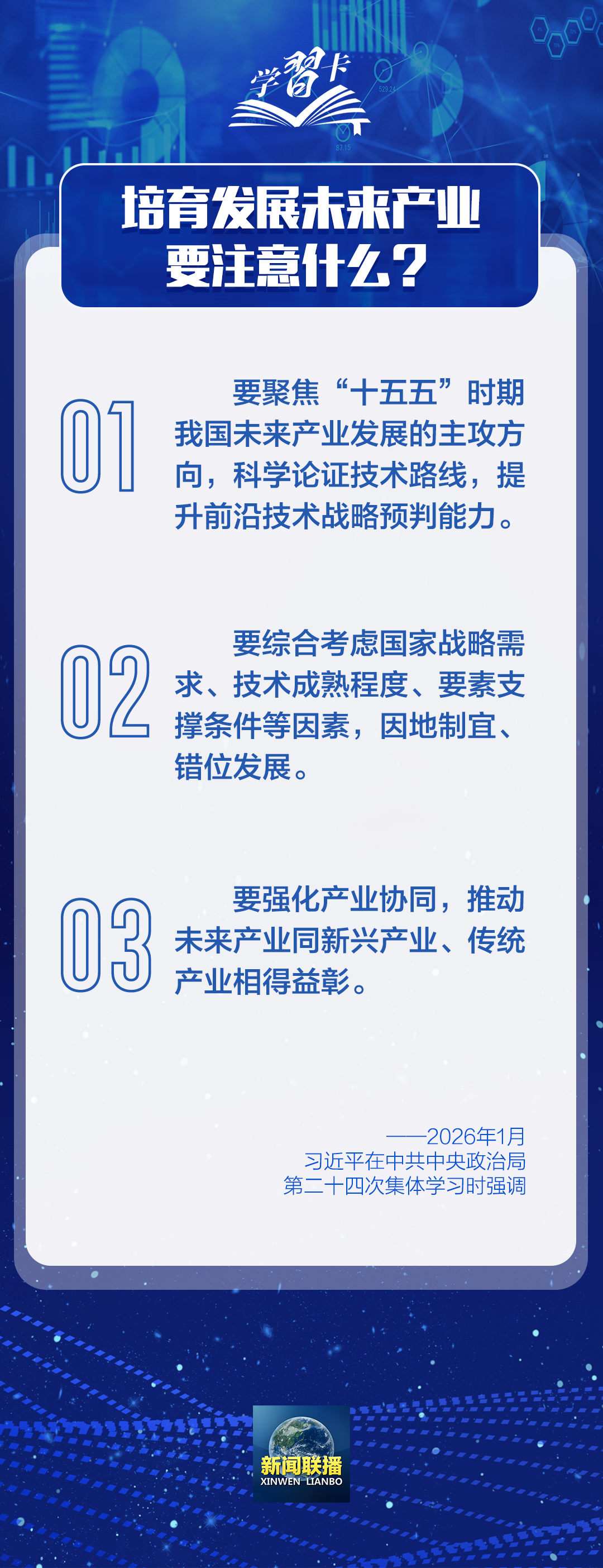 中共中央政治局1月30日下午就前瞻布局和发展未来产业进行第二十四次集体学习。中共中央总书记习近平在主持学习时强调,新一轮科技革命和产业变革加速演进,前沿技术不断涌现,引领和支撑未来产业快速崛起。要站在推进强国建设、民族复兴伟业的战略高度,立足客观条件,发挥比较优势,坚持稳中求进、梯度培育,推动我国未来产业发展不断取得新突破。
