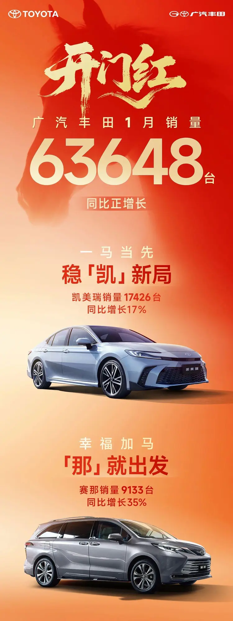 2026年1月,广汽丰田以63,648辆终端销量实现开门红,同比保持正增长。其中,凯美瑞(参数丨图片)贡献17,426辆(同比+17%),赛那售出9,133辆(同比+35%),两大燃油支柱车型持续巩固市场地位。在新能源转型领域,品牌首款纯电轿车铂智3X表现亮眼,用户净推荐值(NPS)达83分,位列紧凑型及以下SUV细分市场第一、全品类总榜TOP5,为3月上市的豪华纯电旗舰铂智7奠定市场信心。