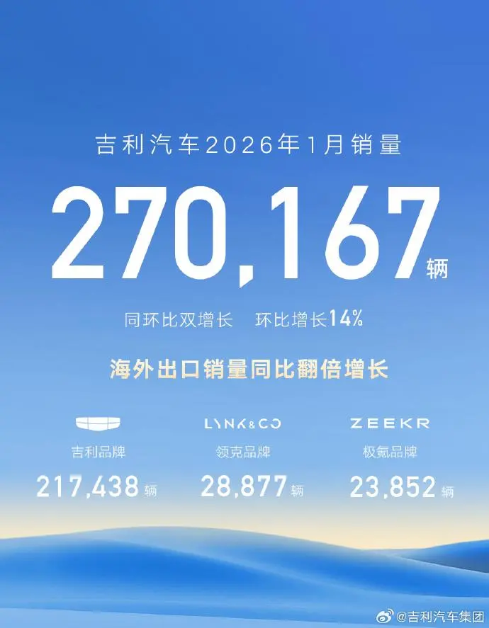 吉利汽车2026年1月总销量达270,167辆,同比增长1%,环比增长14%,首次登顶自主品牌销量榜首。