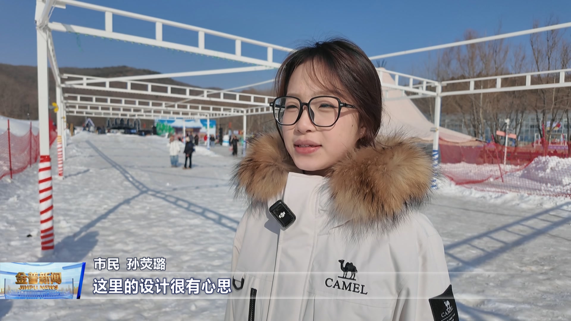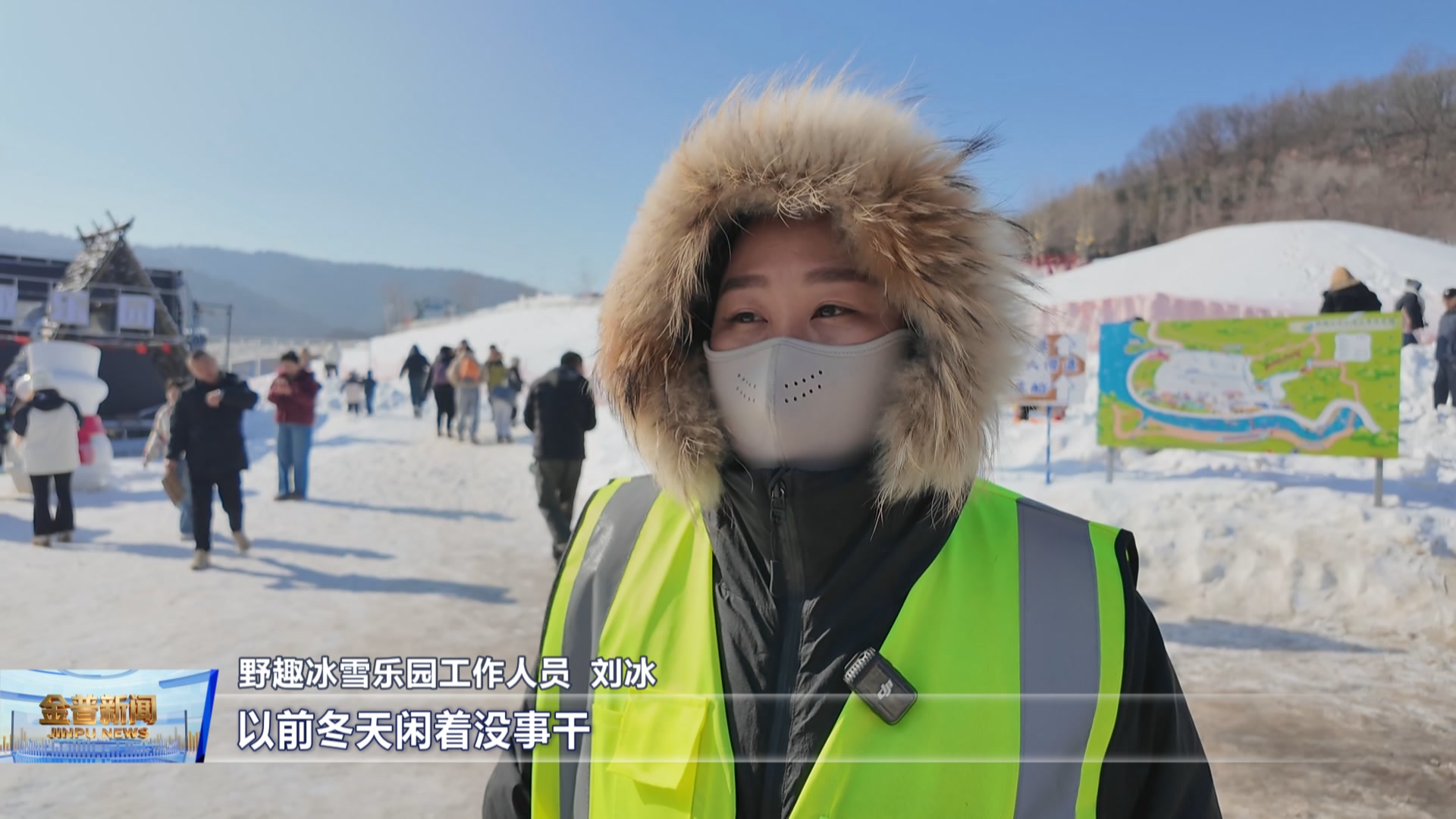 野趣冰雪乐园工作人员刘冰(以前冬天闲在家没事干,现在在雪场负责检票工作,家门口就能挣钱,还能照顾家里,挺好的。)