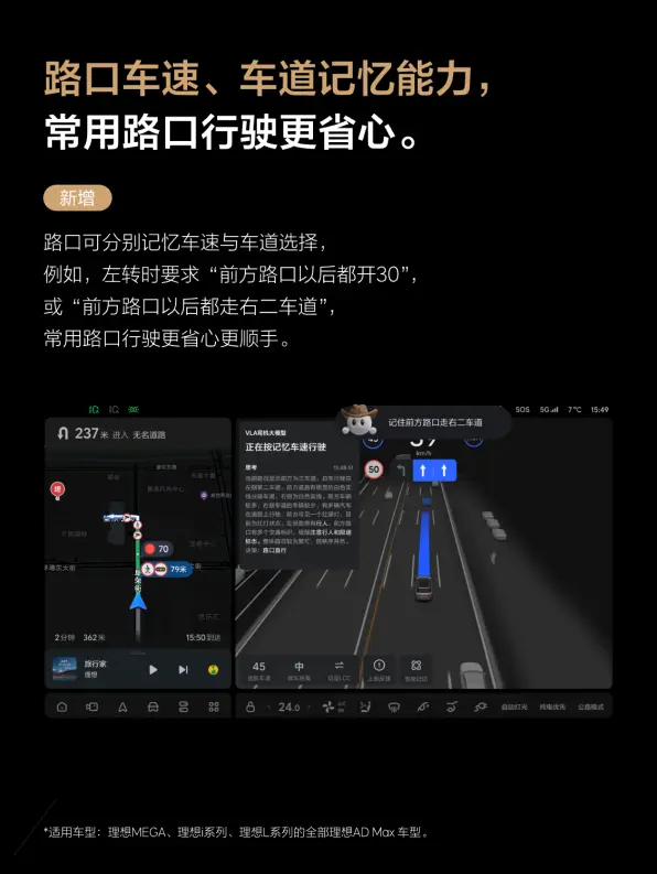 此次升级进一步优化了VLA行车的舒适性,变道更加拟人丝滑。VLA司机大模型的记忆能力得到拓展,新增路口车速记忆功能、路口车道记忆功能,记忆数量无上限,用户可以通过语音指令让车辆记住通过路口时的车速和车道,例如,“前方路口以后都开30”“前方路口以后都走最右侧车道”等。遇到用户模糊表达或表达有歧义时,车辆会主动问询,例如用户下达“转弯”指令后,车辆主动询问用户“向左还是向右”。