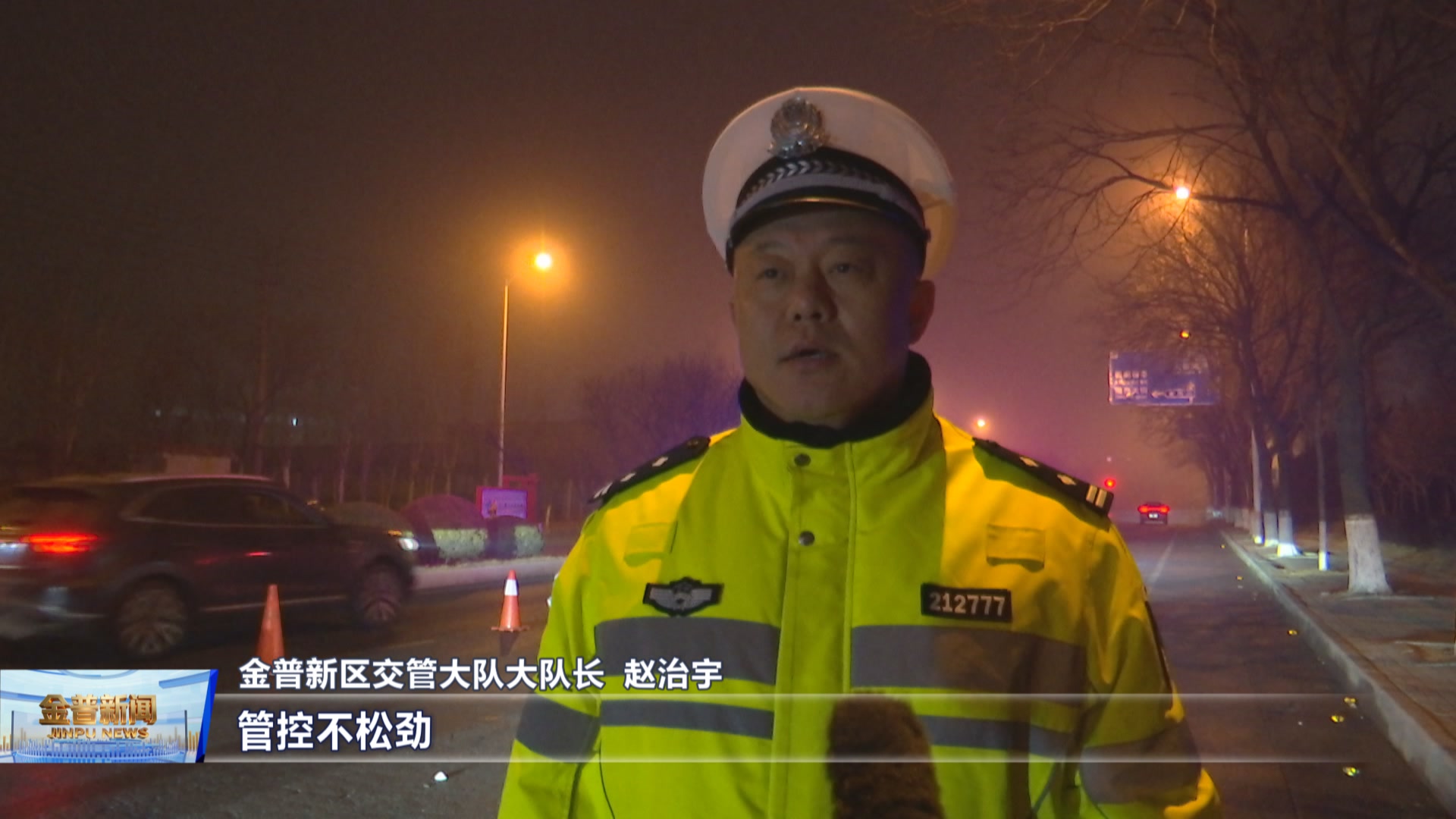 金普新区交管大队大队长赵治宇(喜迎新春,金普交警为您护航。我们假期不打烊、管控不松劲。在此也提醒各位驾驶员朋友:驾车不超速,莫拿生命去竞赛;文明礼让,让出安全;一盔一带,安全常在;牢记喝酒不开车,开车不喝酒。平平安安才是最大的幸福。祝金普全体市民,出行快乐,路畅民安!)