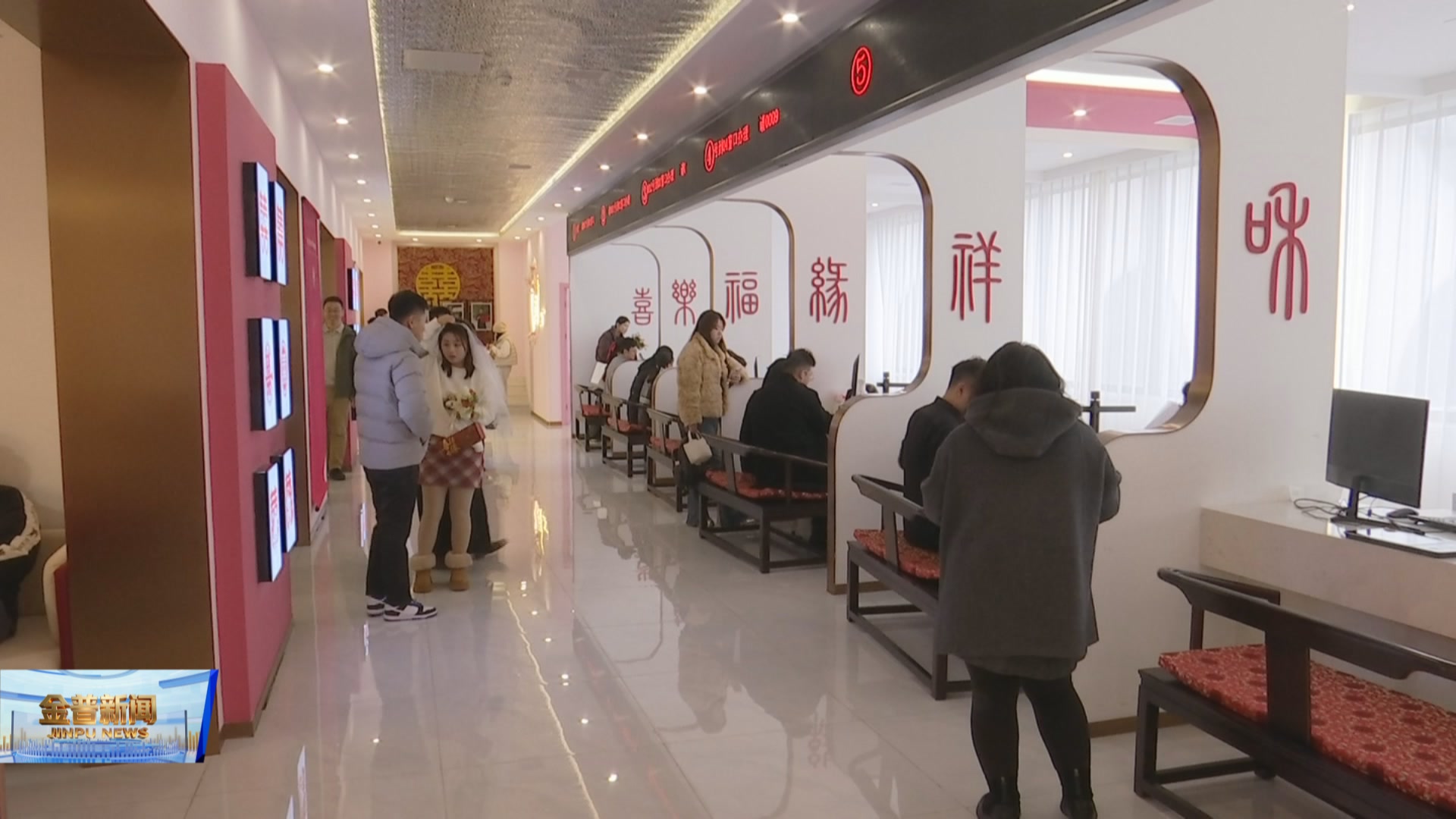 2月14日,恰逢新春首个婚姻登记高峰日,金普新区婚姻登记处推出“幸福加油站 婚姻‘心’起点”特色登记服务活动,通过婚前心理辅导与集体颁证仪式相结合的方式,为新人提供更具温度与内涵的婚姻登记体验。当日办理结婚登记近百对。
