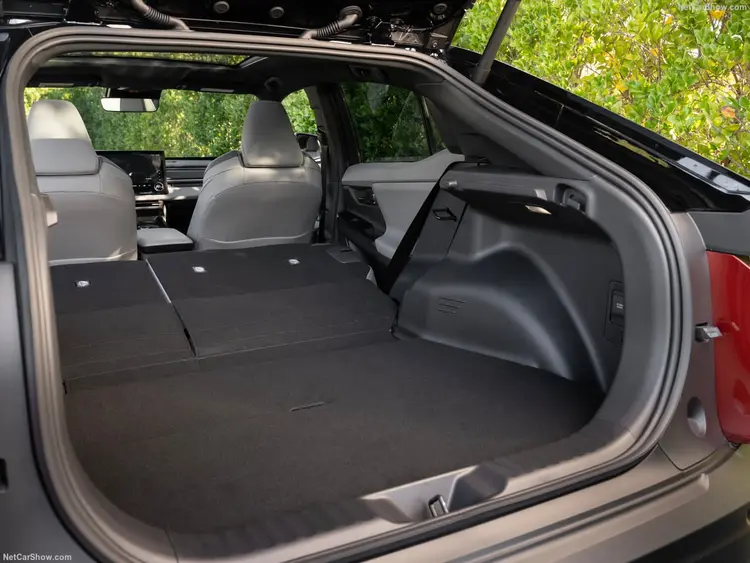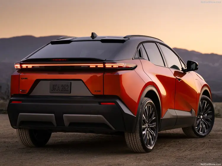 侧面同样没有任何意外,采用Y型腰线,同时保留了上代C-HR的上扬车窗线、C柱隐藏式门把手、宽大的侧裙等设计细节,只是说裙做了一条斜向上的下腰线,整个侧面线条比上代C-HR更流畅、简约一些。尾部保留了大量机甲风,贯穿式尾灯配合双层尾翼设计,硬朗的牌照框和底部扩展器也都是丰田纯电车型的新风格。