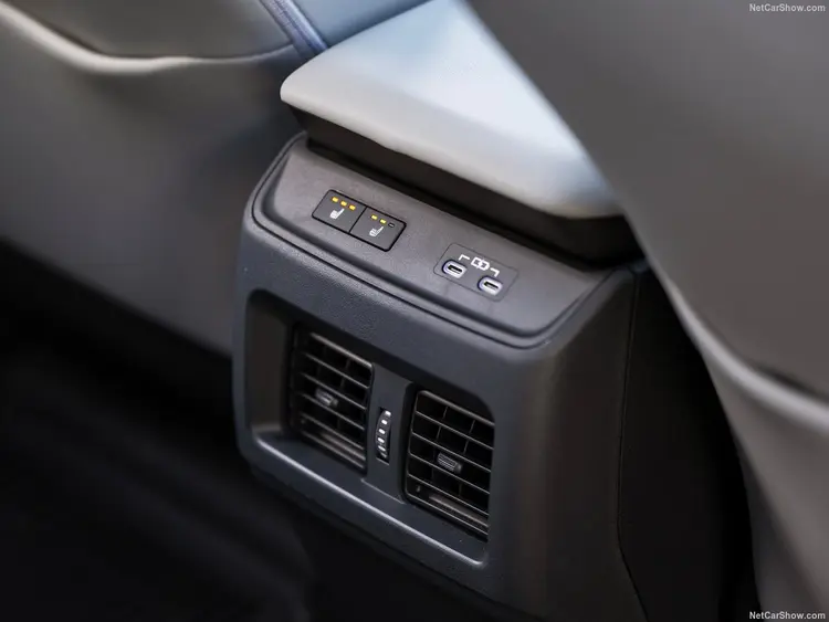 中央操纵台上双无线充电面板中间设计了一个“支柱”,上面是双闪按键,这个小设计很有意思。后面则是旋钮换挡及七个实体按键,就连后排出风口上面也有两个座椅加热按键。