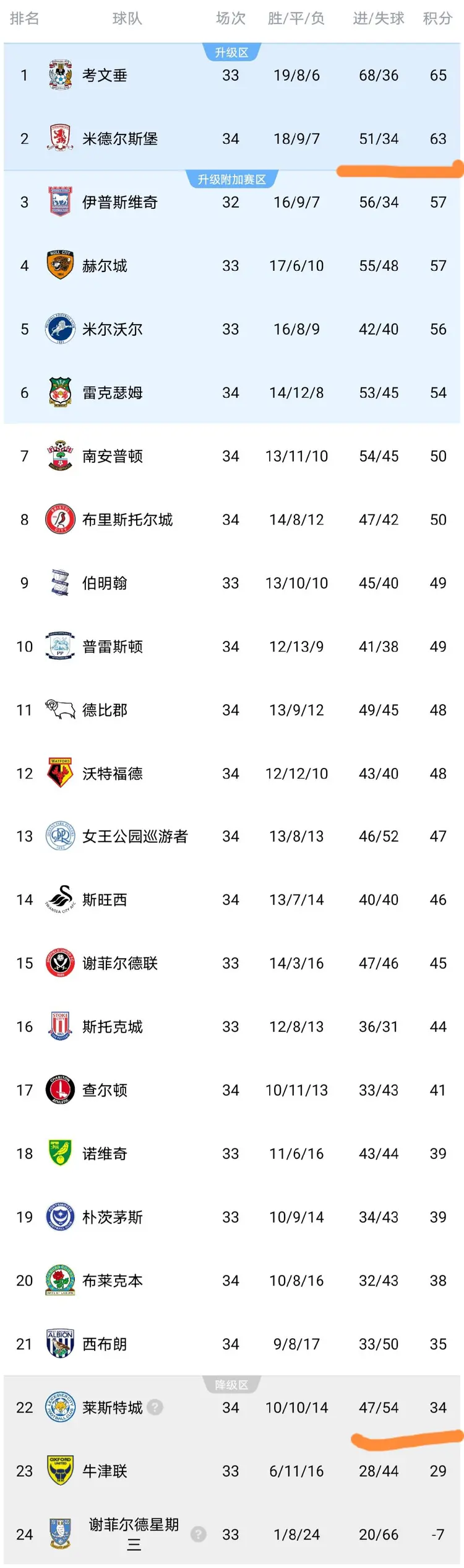 可以看到米德尔斯堡队跟莱斯特城战平之后,积分上涨到了63分,排名第2,没有追平榜首的考文垂队,这显然是天助考文垂队。而莱斯特城队拿到1分之后,积34分继续排名第22,依然处于降级区,莱斯特城队沉沦了,真是出人意料啊。赫尔城击败德比郡之后,积分上涨到了57分,已经追平了第3的伊普斯维奇队,逼近前二了,赫尔城看到了直通英超的希望。雷克瑟姆击败朴茨茅斯之后,积分上涨到了54分,仅差第3的伊普斯维奇队3分,可以说雷克瑟姆也是看到了升级希望。而南安普顿大胜之后,看到了冲击升级附加赛区的希望。