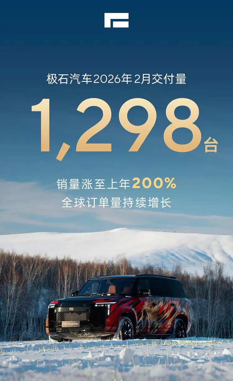 日前,极石汽车正式公布了2026年2月的交付数据。官方统计显示,极石汽车在2月共交付新车1298台。与去年同期相比,销量涨幅显著,达到上年同期的200%,展现出强劲的增长势头。同时,官方表示全球范围内的订单量也在持续增长中。