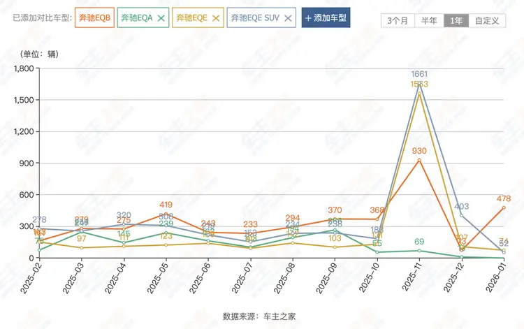 奔驰在华新能源销量的低迷,早已是不争的事实。数据显示,2026年1月奔驰电动车型在华销量仅3800台,与宝马、奥迪合计销量不足1.2万台,在豪华新能源市场占比不足10%,远低于行业平均增速。