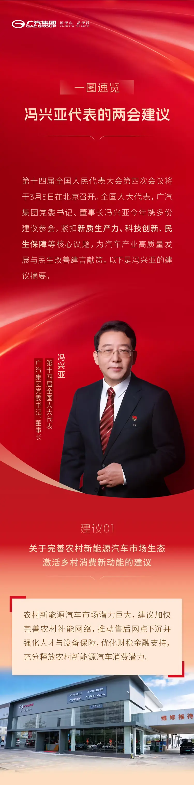 3月4日,据广汽集团官微,全国人大代表,广汽集团党委书记、董事长冯兴亚今年携多份建议赴京,围绕新质生产力、科技创新、民生保障等核心议题,为汽车产业高质量发展与社会民生改善建言献策。