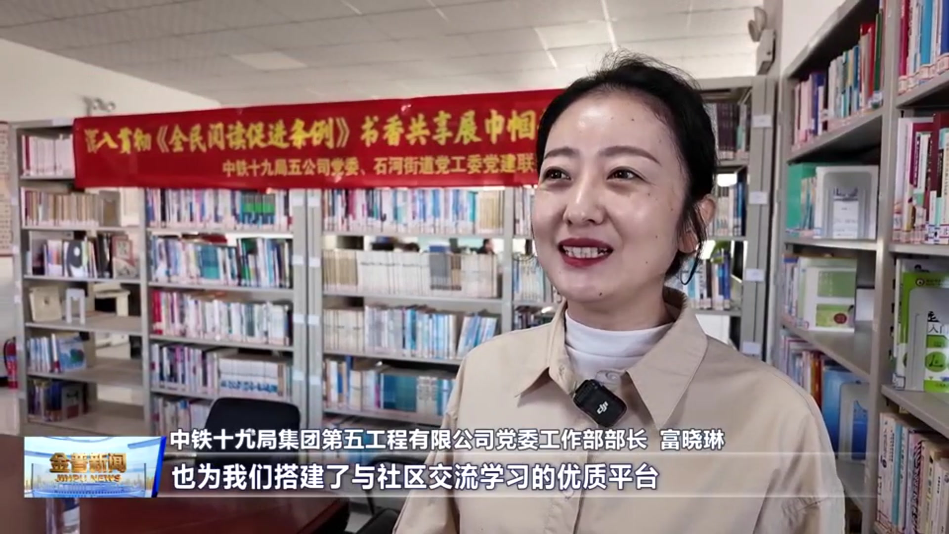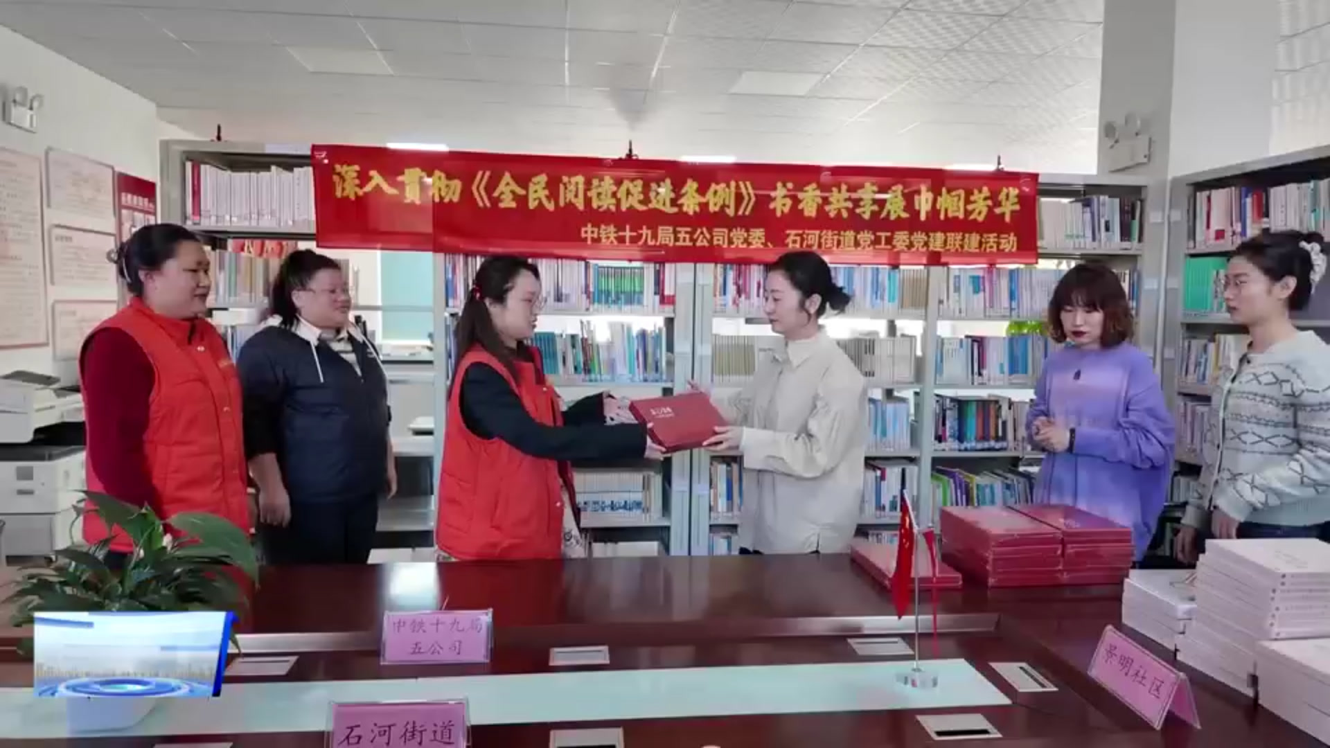 中铁十九局集团第五工程有限公司党委工作部部长富晓琳(这些图书既丰富了社区书屋的藏书品类,也为我们搭建了与社区交流学习的优质平台,让书香成为联结政企情谊的重要纽带。)