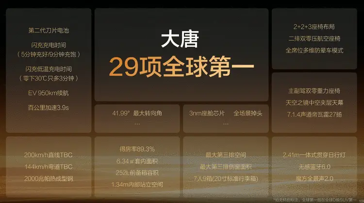 比亚迪第二代刀片电池及闪充技术发布会上正式发布比亚迪大唐车型,新车为王朝网最大的SUV车型,定位大型SUV,车长接近5.3米,轴距达到3130毫米,采用2+2+3的7座布局。新车高度还原了此前备受瞩目的Dynasty-D概念车设计,搭载比亚迪最新的第二代刀片电池、闪充技术实现5分钟充好,9分钟充饱、天神之眼辅助驾驶、双腔空悬、后轮转向、纯电版续航950公里等配置。