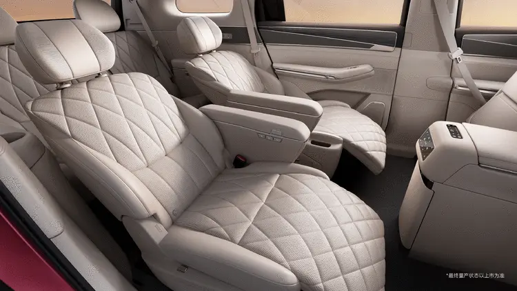 大唐将采用三排7座的座椅布局。为了提升核心家庭成员的乘坐体验,主副驾配备零重力座椅,第二排配备了宽大舒适的独立零压航空座椅,表面采用精致的菱形缝线工艺以提升豪华质感。二排座椅带有一体式电动腿托,并支持一键躺平功能。