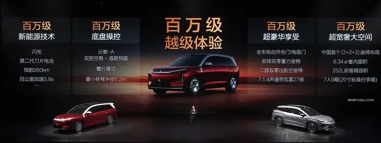 新车将提供纯电与混动两种动力形式。纯电版分为单电机,提供300kW和370kW两个功率版本,双电机四驱版本,前电机215kW,后电机370kW。高配车型0-100km/h加速时间可达3.9秒。纯电版最长续航950公里。混动版搭载第六代DM系统,匹配单电机。