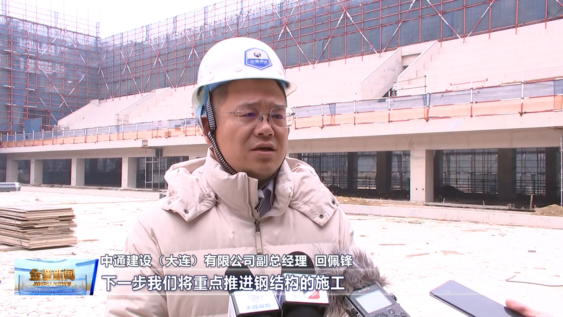 中通建设(大连)有限公司副总经理回佩锋(新年伊始我们的钢结构材料已经进场了 下一步我们将重点推进钢结构的施工 然后还有精装工程施工 外幕墙工程的施工 景观工程施工 力保如期交付。)