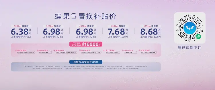 缤果S提供325km尊享款、325km旗舰款、430km尊享款、430km旗舰款、525km旗舰款五款配置,上市指导价为6.68万-8.98万元,叠加置换政策可享置换补贴价6.38万-8.68万元,更可叠加享受国家/地方购车补贴。