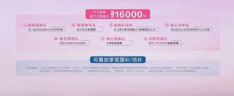 广大用户可通过五菱汽车APP/小程序等线上渠道下订,立享至高价值16,000元的“孟子义甄选礼”,其中包括“超级置换礼”:无门槛超级置换补贴3000元;“限时购车礼”:限时赠送交强险;“金融补贴礼”:5.5万2年0利息或7年低息超长贷;“贴心守护礼”:赠送价值3000元3M太阳膜;“电力满满礼”:赠送充电桩及安装服务;“安心质保礼”:三电终身质保;“无限流量礼”:购车三年内车机无限流量。