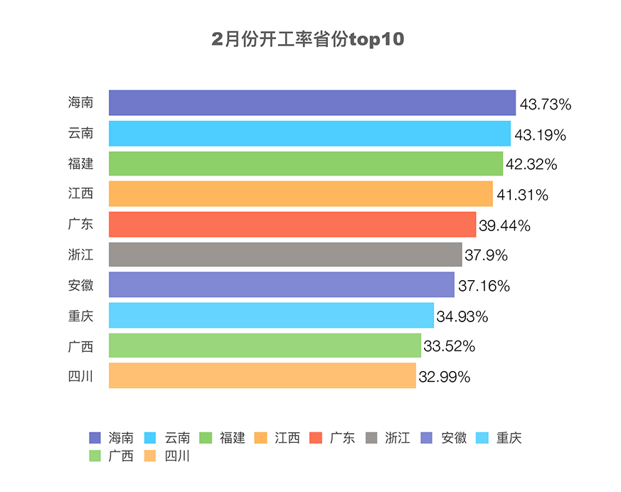 2月份综合开工率排名前十的省份分别是:海南、云南、福建、江西、广东、浙江、安徽、重庆、广西和四川。受春节假期与气候条件影响,南方省份户外施工条件更优,项目复工与连续作业能力更强,成为2月工程机械开工率的主要支撑区域。