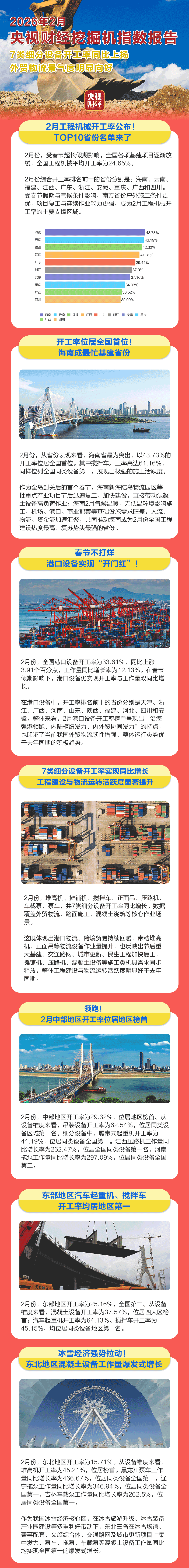 作为全岛封关后的首个春节,海南新海陆岛物流园区等一批重点产业项目节后迅速复工、加快建设,直接带动混凝土设备高负荷作业;海南2月气候温暖,无低温环境影响施工,机场、港口、商业配套等基础设施需求旺盛,人流、物流、资金流加速汇聚,共同推动海南成为2月份全国工程建设热度最高、复苏势头最强的省份。