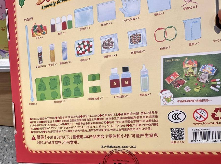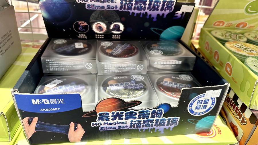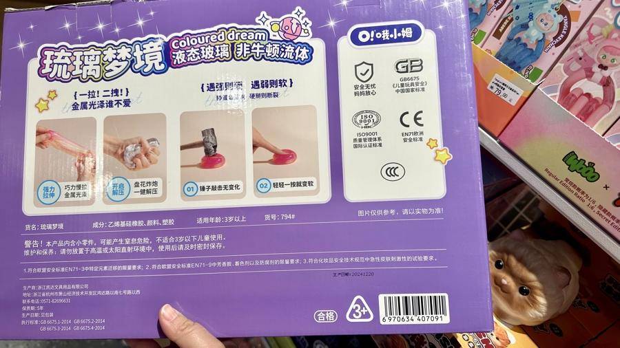 新民晚报记者观察到,在连锁品牌文具店里,此类产品的标注内容均较为规范。在“九木杂物社”中,除基础的水晶泥,也有琳琅满目的“解压礼盒”“液态玻璃”等,外包装的适用年龄、警示标识等都非常醒目,有些还有3C认证或欧盟认证标识。当然,这些产品的售价也略高,大多在几十元甚至上百元不等。