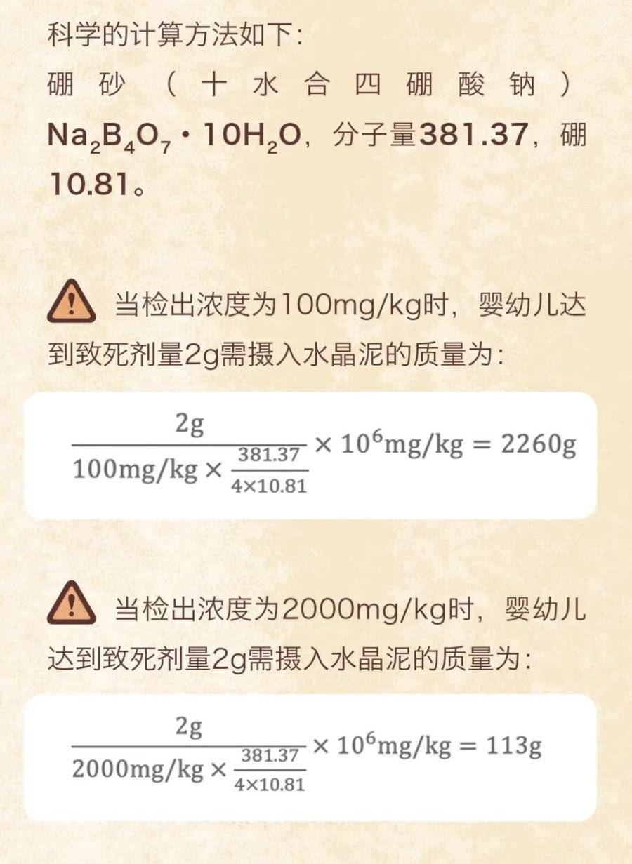 假设硼全部以硼砂的形式存在,以网传检出的最高浓度(5000mg/kg)计算,婴幼儿需要一次性摄入45g水晶泥(约一小盒)才可能达到致死剂量2g。而以本市实验室的实测浓度(100mg/kg-2000mg/kg)来看,婴幼儿需要一次性摄入113g-2260g水晶泥才会达到致死剂量。