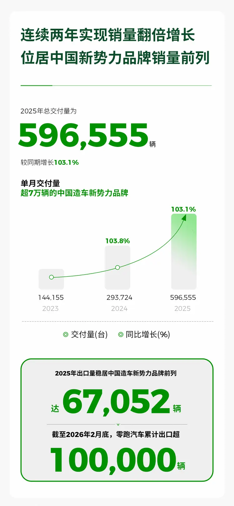 网易汽车报道,零跑汽车(9863.HK)发布2025年全年财报,交出了一份“规模与盈利双突破”的成绩单:全年交付596555台,同比增长 103.1%,登顶中国新势力品牌年度销量榜首;首次实现全年净利润5.4 亿元,成为中国造车新势力中第二家实现年度盈利的企业。营收647.3 亿元,同比增长101.3%,毛利率14.5%创历史新高,同时在手现金达378.8亿元,经营现金流与自由现金流持续为正。