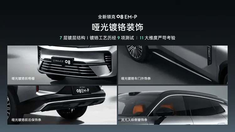 设计上,此次上新的领克08 EM-P极光套装以极光银外观与曙光橙内饰的撞色方案为核心,并搭配全新20英寸轮毂及哑光镀铬工艺装饰件。值得一提的是,外观上的镀铬饰件采用七层复合镀层结构的哑光镀铬工艺,兼具防腐防锈、耐磨防刮、防氧化多重特性。同时,全新20英寸流光轮毂的20条放射状辐条,以18°精准排布与车身完美呼应。