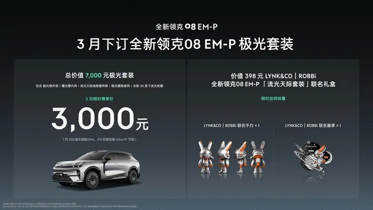 网易汽车3月19日报道 日前从官方获悉,领克汽车正式发售全新领克08 EM-P极光套装,套装售价7000元,限时价优惠价3000元。同时,官方也宣布,全新领克08EM-P计划于第二季度推送LYNK Flyme Auto 2.2.0智能座舱系统,千里浩瀚H7安全辅助驾驶将解锁D2D车位到车位领航驾驶辅助,并优化智舱体验与主动安全等多种功能。在购车政策上,全新领克08 EM-P限时专享价15.98万元起,同步上新三月专属权益:2026年3月31日(含)前完成大定锁单并提车的用户,至高享2万元春日焕新礼及1.5万元国家置换补贴;搭配7年低息、2年0息等多种金融方案。