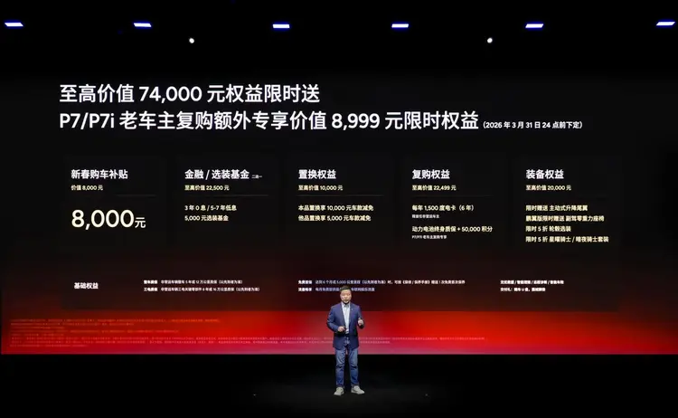 即日起至2026年3月31日24点前下定小鹏P7,用户可享受至高74,000元的配置限时送权益,包括价值8,000元的新春购车补贴,并可二选一享受5,000元选装基金,或3年0息/5-7年低息的金融购车权益;同时,置换用户可获至高10,000元置换权益,复购用户可享至高22,499元复购权益。在外观方面,小鹏提供了至高价值20,000元的装备权益,两款新色套装及轮毂选装的限时半价优惠,主动式升降尾翼限时赠送,购买鹏翼版车型的朋友还可额外获赠副驾零重力座椅。