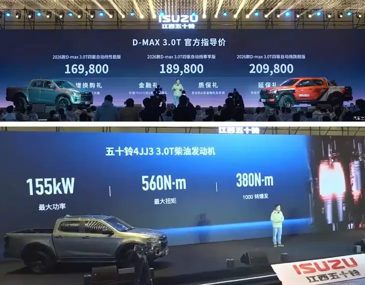 江西五十铃全新D-MAX 3.0T正式上市,新车共推出3款四驱自动挡车型,官方指导价16.98万—20.98万元,以硬核柴油动力与专业越野底盘,填补高端性能皮卡市场空白。