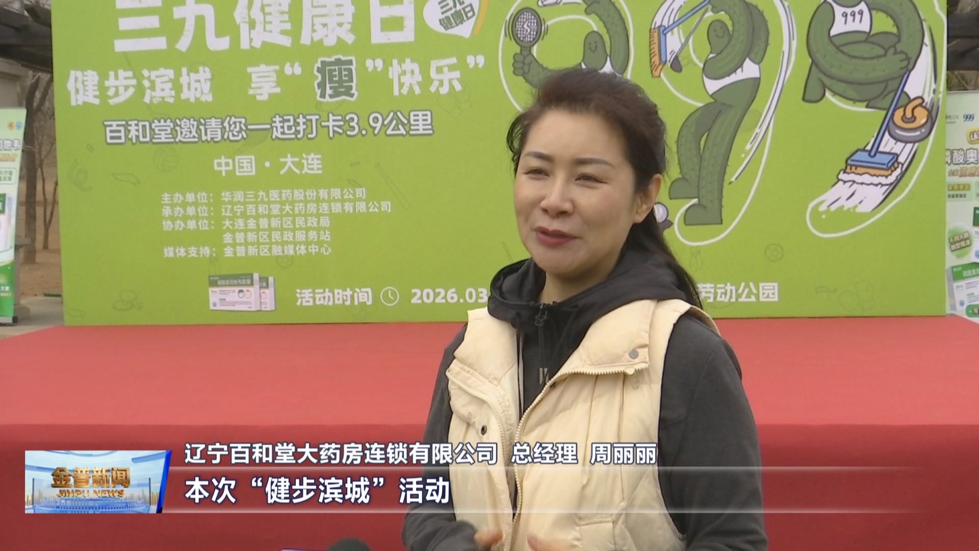 辽宁百和堂大药房连锁有限公司总经理周丽丽(本次“健步滨城”活动,旨在普及健康知识,倡导科学运动、合理膳食,更助力提高全民健康意识,让大家都做自己健康的第一责任人。)