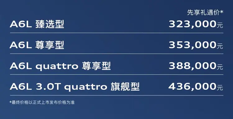 网易汽车报道 全新奥迪A6L(参数丨图片)3月25日正式上市。新车目前已经开启预售,共有4款配置可选,先享礼遇价为32.3-43.6万元同时还推出包括增购、置换在内的四重预售好礼。作为换代车型,全新奥迪A6L基于PPC豪华燃油车平台生产,新车的外观、尺寸、智能座舱、驾驶辅助以及动力总成等方面均有升级。