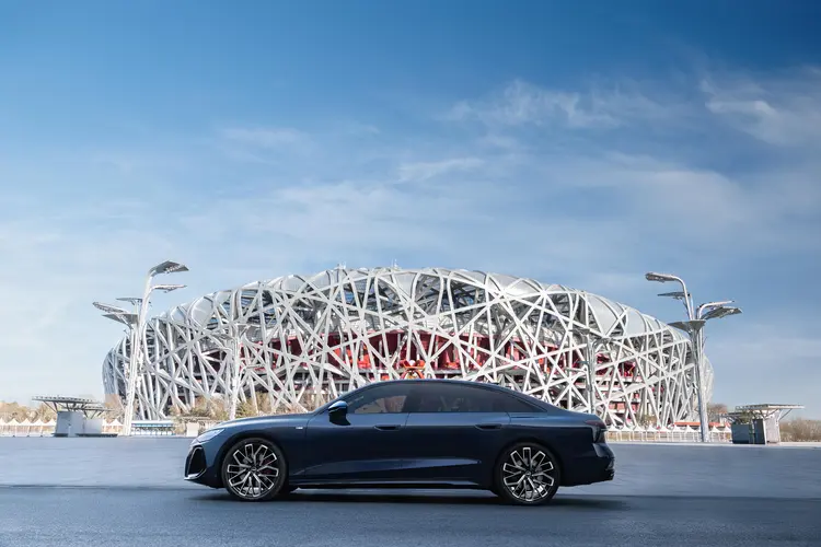 前脸采用奥迪家族最新 “六边形大嘴” 格栅,提供熏黑蜂窝与镀铬点阵两种风格可选,格栅中央嵌入可发光星徽,配合Digital Matrix LED数字矩阵大灯,不仅能实现动态迎宾光效,还可投射导航指引符号与行人警示标识。前包围两侧纵向布局的通风口与梯形进气口,进一步强化空气动力学效率,整车风阻系数低至0.23Cd,在同级燃油轿车中处于领先水平。