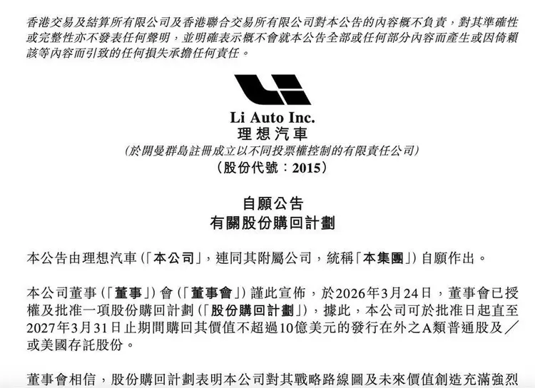 3月24日晚,理想汽车公告称,董事会已批准一项股份回购计划,公司获授权在批准日期起至3月31日期间,购买最高10亿美元的A类普通股和/或美国存托股。值得一提的是,这是理想汽车自2020年赴美上市以来首次实施股份回购。