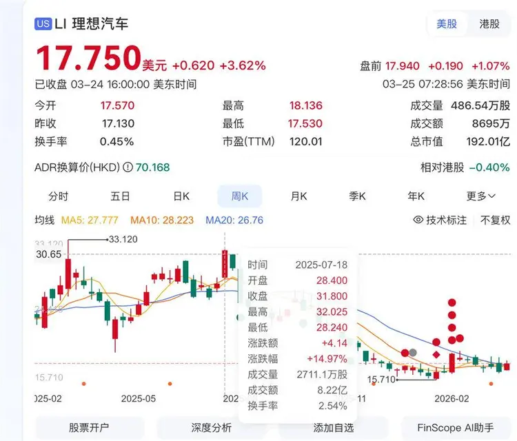 在此次回购之前,理想汽车股价经历了近一年时间的持续走低。或受此消息影响,理想汽车美股盘前直线拉升,开盘后股价持续上涨,盘中涨幅一度超过5%。次日,理想汽车港股同步上涨3.3%,报价69.8港元每股。