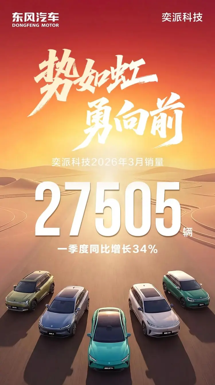 东风汽车旗下奕派科技发布最新销量数据:2026年3月单月交付新车27505辆,2026年第一季度累计交付量同比增长34%。