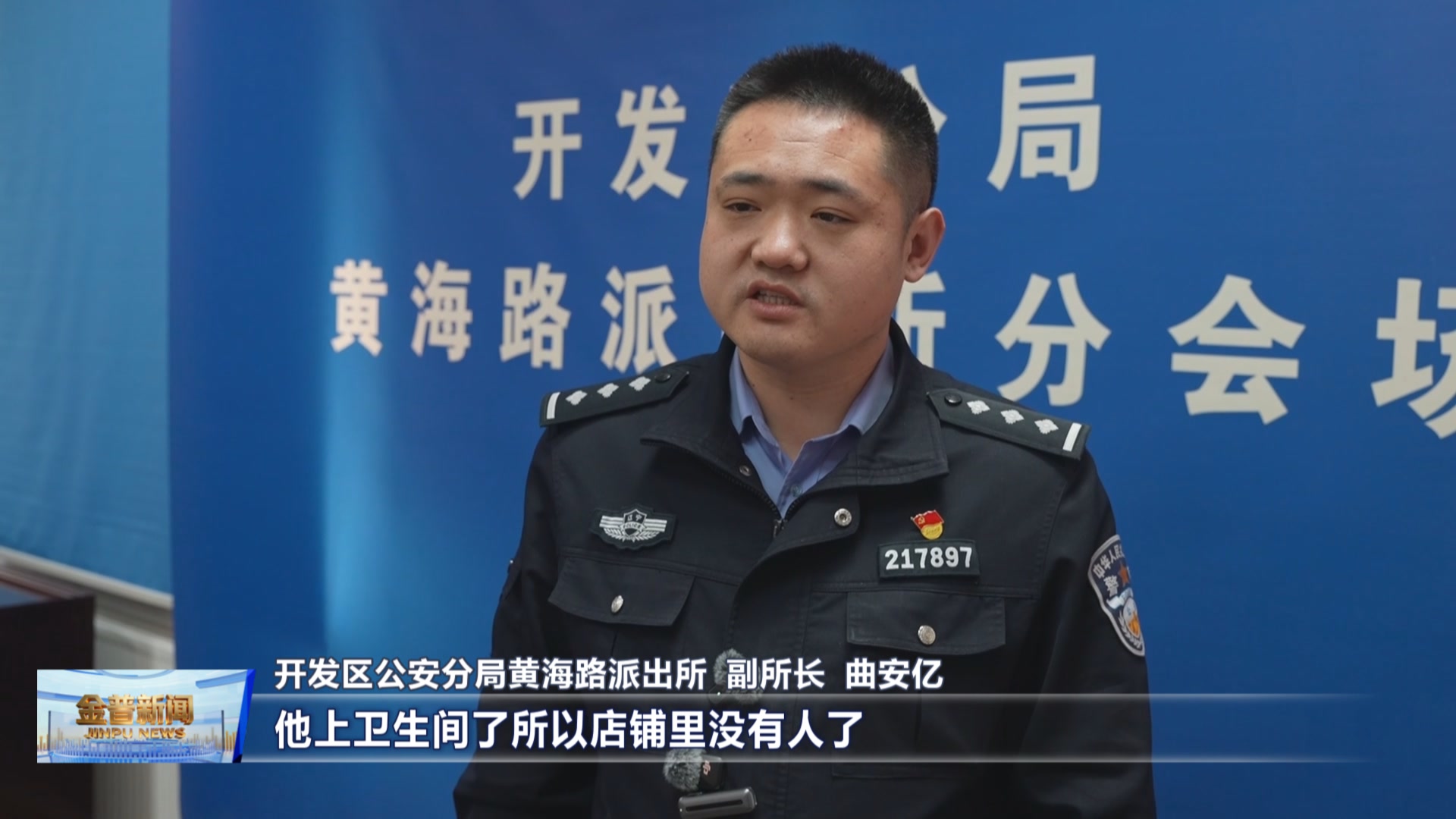开发区公安分局黄海路派出所副所长曲安亿(我们到场后联系报警人,报警人当时只有一个人在店铺,他上卫生间了,所以店铺里没有人了,他返回店铺的时候,发现手机丢失了,立即调取了监控,发现有一名陌生男子趁店铺里无人的时候,将手机直接拿走了。)