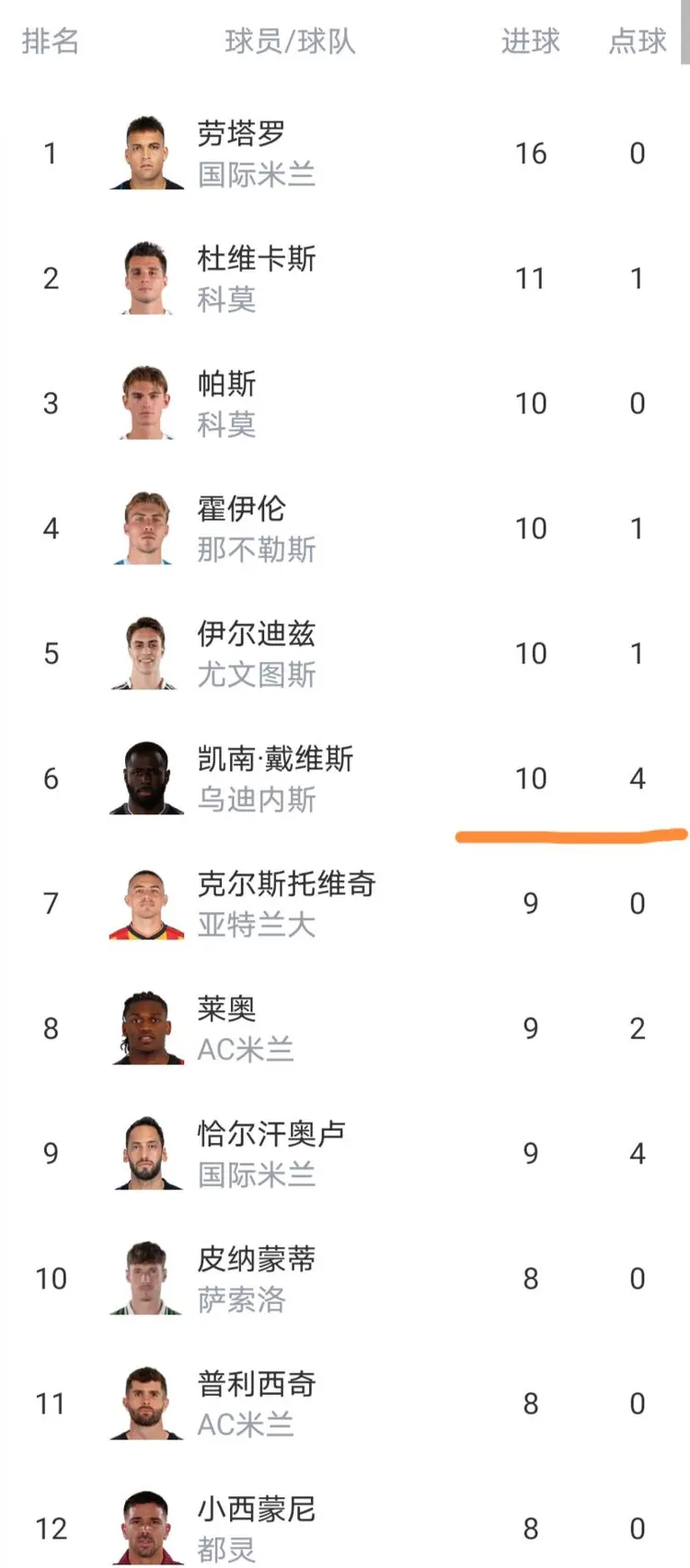 射手榜6人进球上双,劳塔罗5球优势领跑。